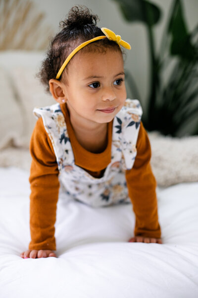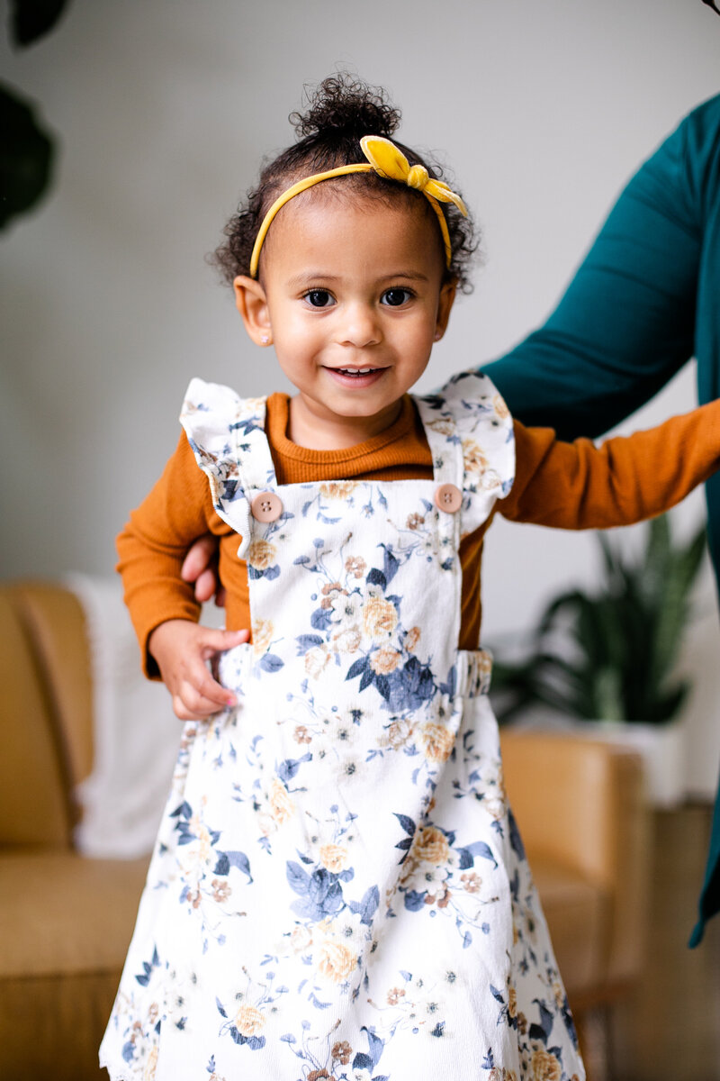If your session takes place in the fall, while it might be tempting to dress your little one in a pumpkin costume to eternally remember the cuteness that babies in costumes in giant piles of leaves holds, I advise keeping attire a little more neutral.